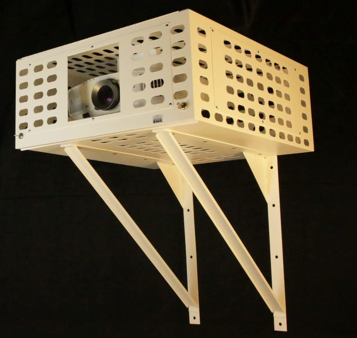 The Projector Protector Wall mount edition comes in 3 sizes. It will accommodate any projector on the market today. The front panel is hinged and will swing up for access. It locks with 2 keys for double security.