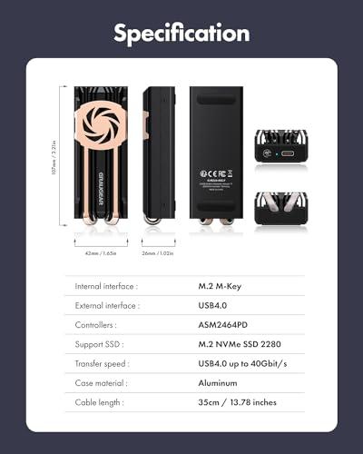 - 40Gbps Ultra High SpeedUSB 4.0 ASM2464PD chipset supports USB-C(USB Type-C) connection and data transmission speed up to PCIe 4.0 x4 40Gbps for steady and efficient data transfer. Compatible with Thunderbolt 4/3 and backward compatible with USB 3.2/3.1/3.0/2.0 at respective speed limits (Please be sure to use USB 4.0 or Thunderbolt 4 interface and upgrade the OS build and NVM FW version to the lastest version to achieve 40Gbps transfer speed. Backward compatibility will limit the speed, and the device might not be recognized)